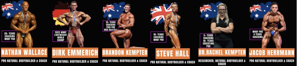 - Six international world class natural bodybuilding coaches